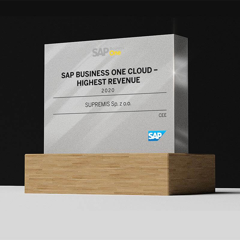 Za 2020 rok zostaliśmy uhonorowani przez SAP nagrodą za największą sprzedaż rozwiązania SAP Business One Cloud. Oznacza to, że w regionie CEE jesteśmy liderem rozwiązań chmurowych dla SAP Business One.