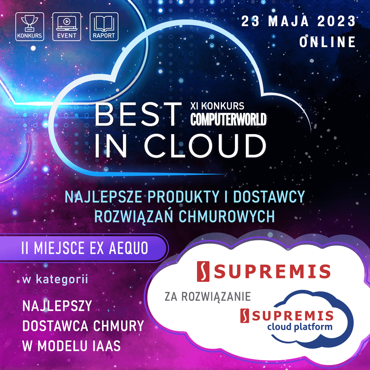 SUPREMIS zdobywa złoto w konkursie Best in Cloud 2024 organizowanym przez Computerworld Polska, zdobywając tytuł NAJLEPSZEGO DOSTAWCY CHMURY IAAS! Nasza autorska platforma SUPREMIS Cloud Platform została uznana za najlepszą w tej kategorii, co umacnia naszą pozycję lidera w branży rozwiązań chmurowych.