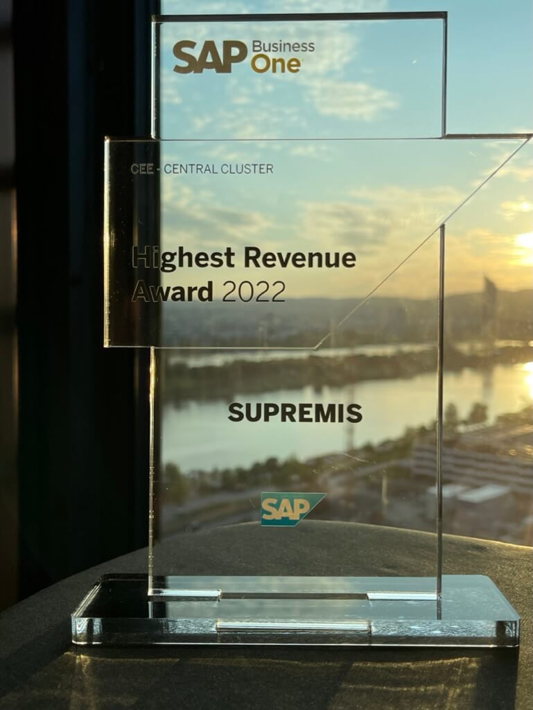 Z dumą informujemy, że podczas spotka partnerskiego w Wiedniu, SAP uhonorował nas statuetką Highest Revenue Award za najlepsze osiągnięcia w 2022 w kategorii SAP BusinessOne regionu Europy Centralnej i Wschodniej. To najlepszy dowód na to, jak poważnie traktujemy swoją misję i jak ważnym produktem dla SUPREMIS jest SAP BusinessOne.